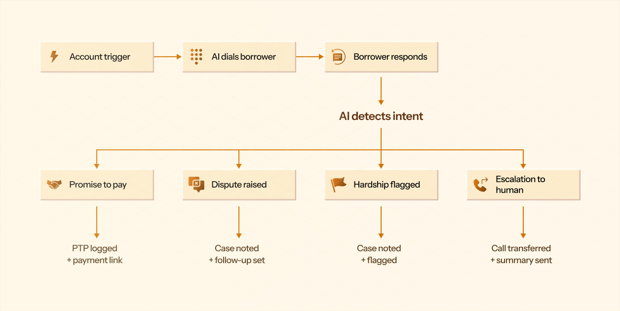 This matters for collections specifically because recovery conversations aren't linear. A borrower might say they'll pay next week. They might ask for a settlement. They might explain a change in circumstances. An AI agent trained for collections can handle each of these paths and route to a human agent when the conversation requires it.