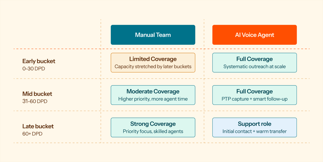 What also changes is scale and consistency. The same conversation with the same tone, the same disclosures, the same documented outcome can happen across thousands of accounts simultaneously. Early-stage delinquency, which is often underserved in manual operations, can be addressed as systematically as late-stage recovery.