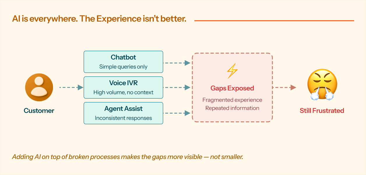 When AI deployments are unstrategic, the damage is real. Customers get partial answers, repeat themselves across multiple touchpoints, and get transferred before anyone actually resolves their issue. Behind the scenes, operations teams are still carrying the same load because now they're also handling AI-generated exceptions.