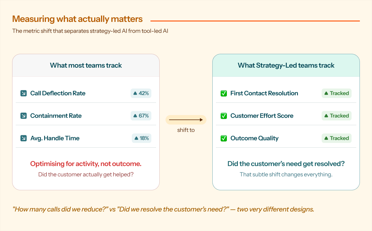 Resolution rates, customer effort scores, and downstream behavior tell a more honest story than call deflection metrics alone. If the goal is better outcomes, the measurement has to reflect that.