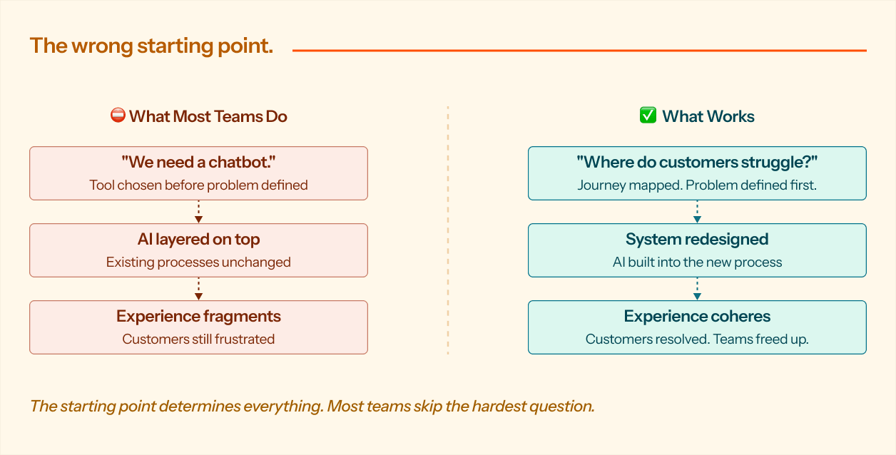They map out specific moments onboarding, renewals, claims, service escalations and ask hard questions. Where do customers get stuck? Where are agents spending time on work that doesn't require human judgment? Where does information break down between teams? Only then does AI enter the picture, built into a redesigned process rather than bolted onto an existing one.